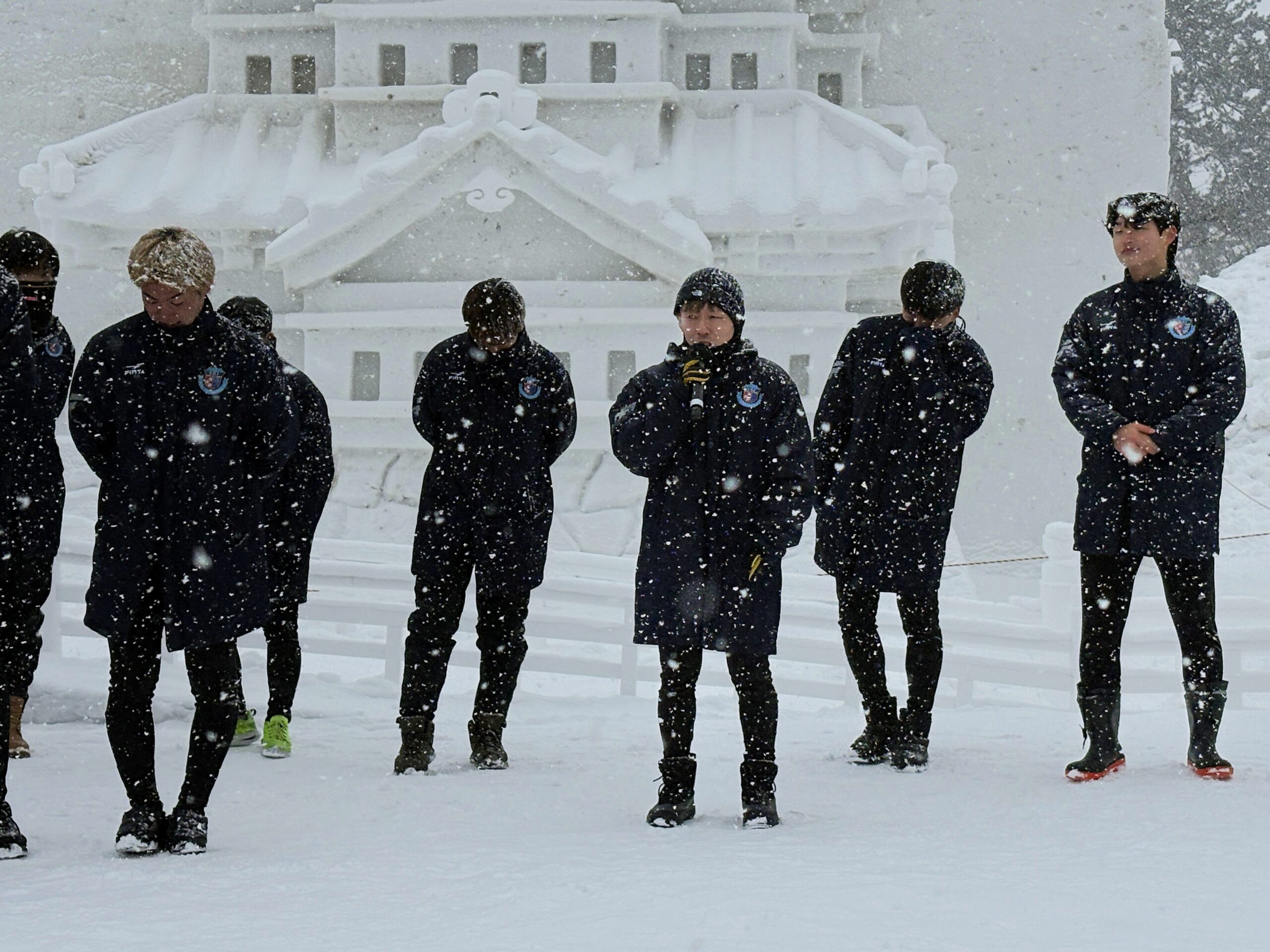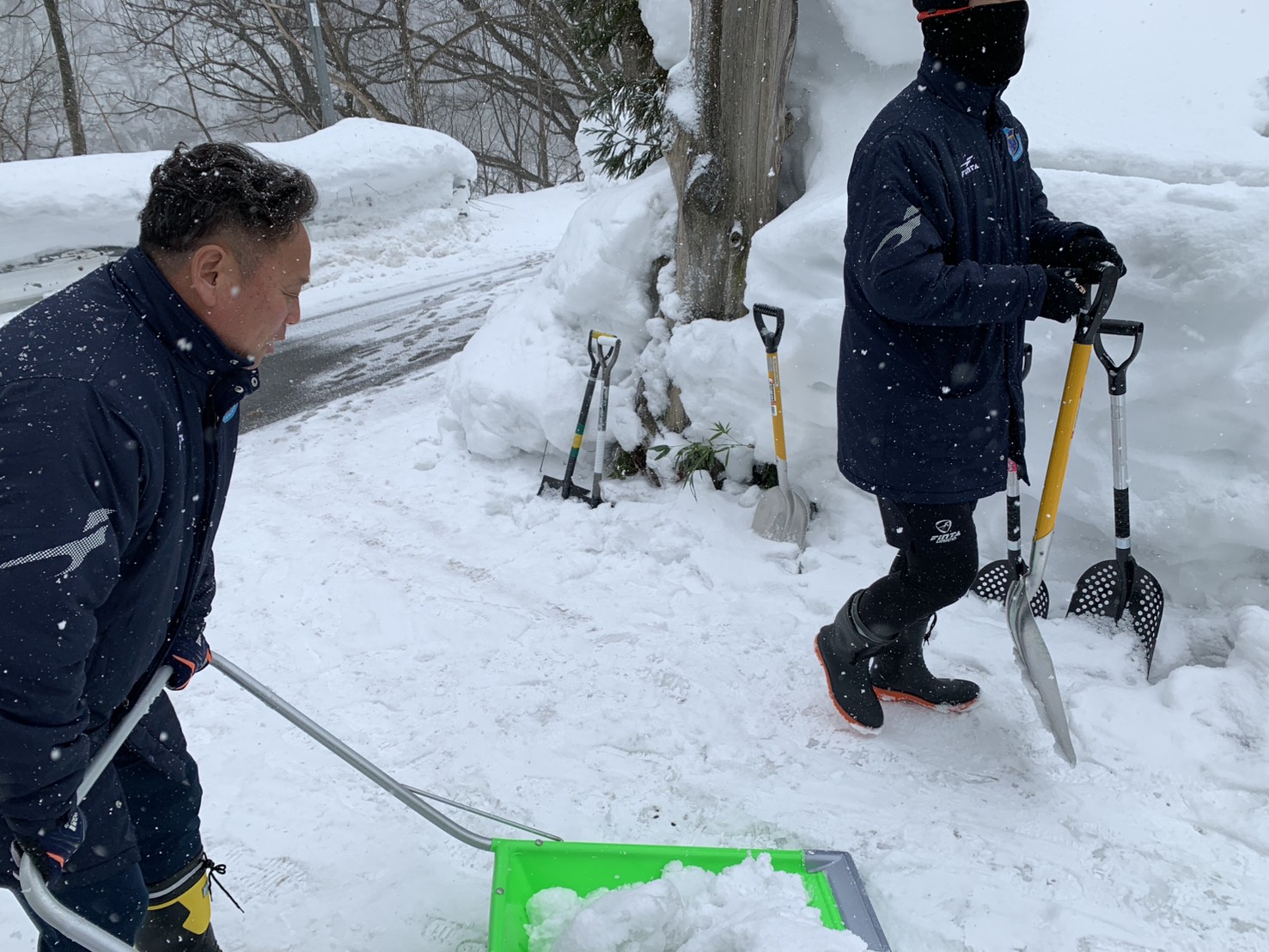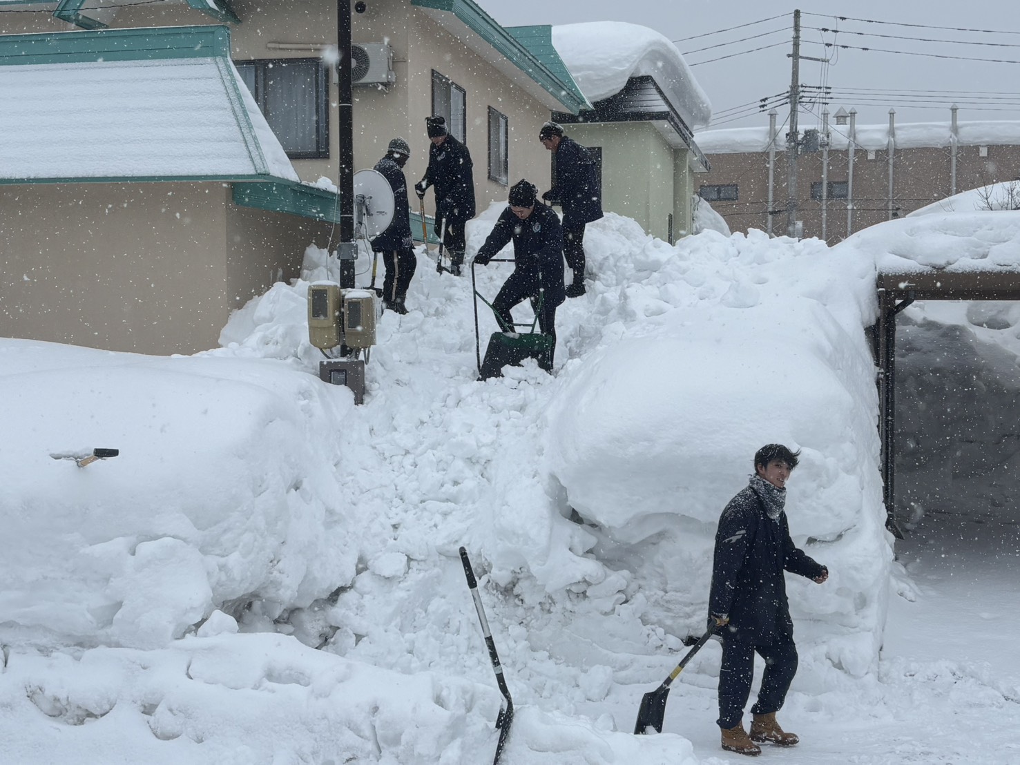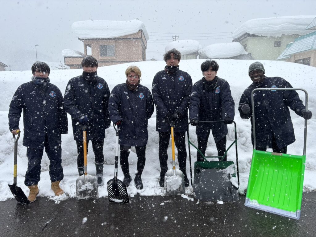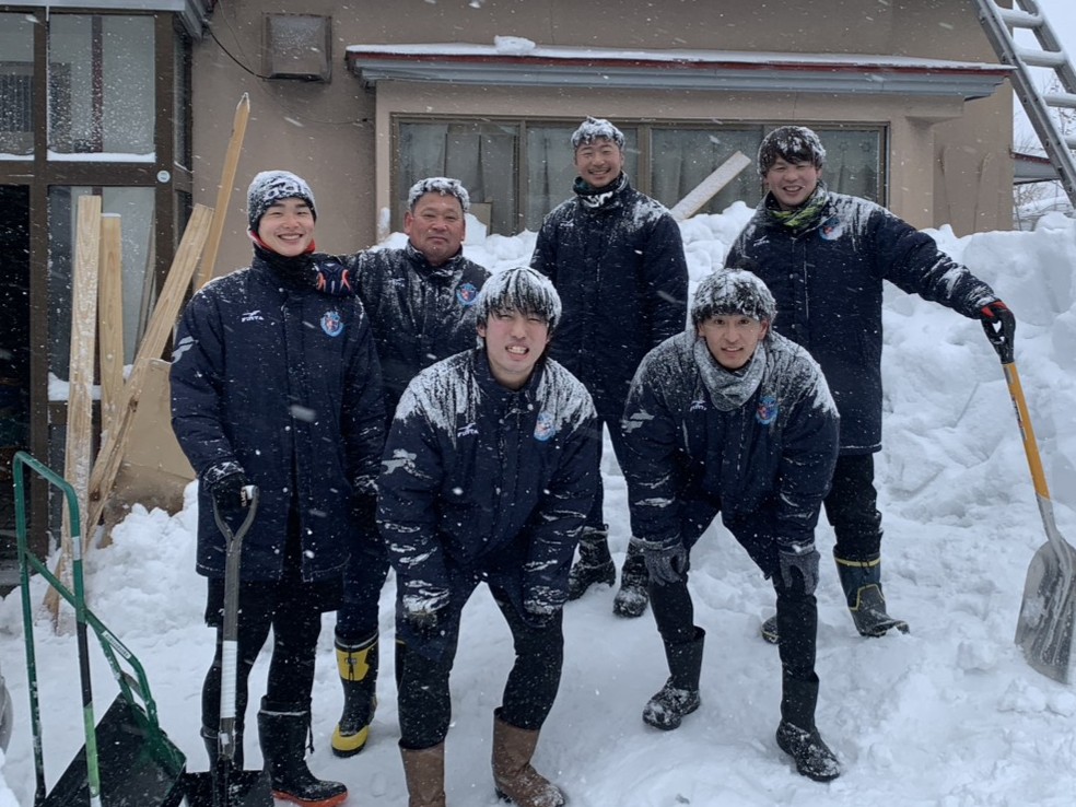 ボランティア活動には、中三川監督をはじめ、選手・スタッフ15名が参加し、二組に分かれて一人暮らしの高齢者のお宅2か所の除雪を行いました。屋根まで積もった硬い雪に苦戦しながらも、地域の皆様が安全に過ごせるよう声を掛け合って作業しました。