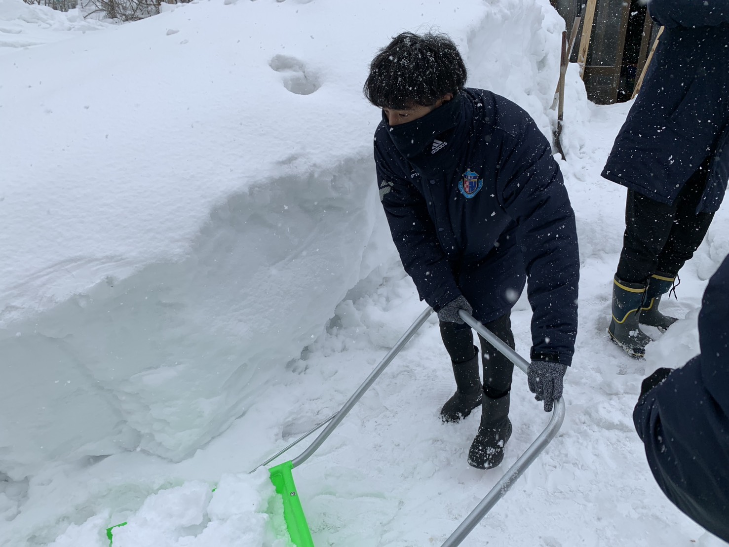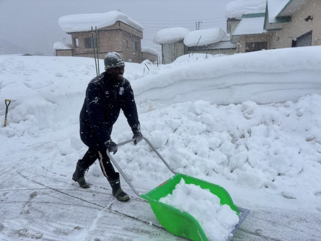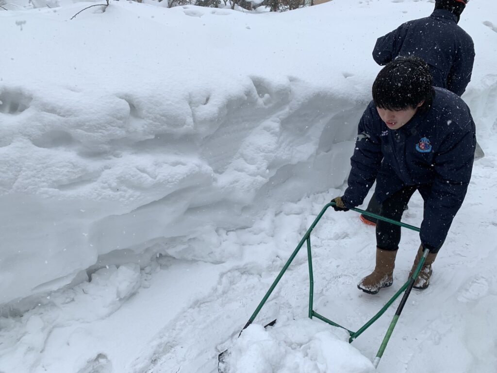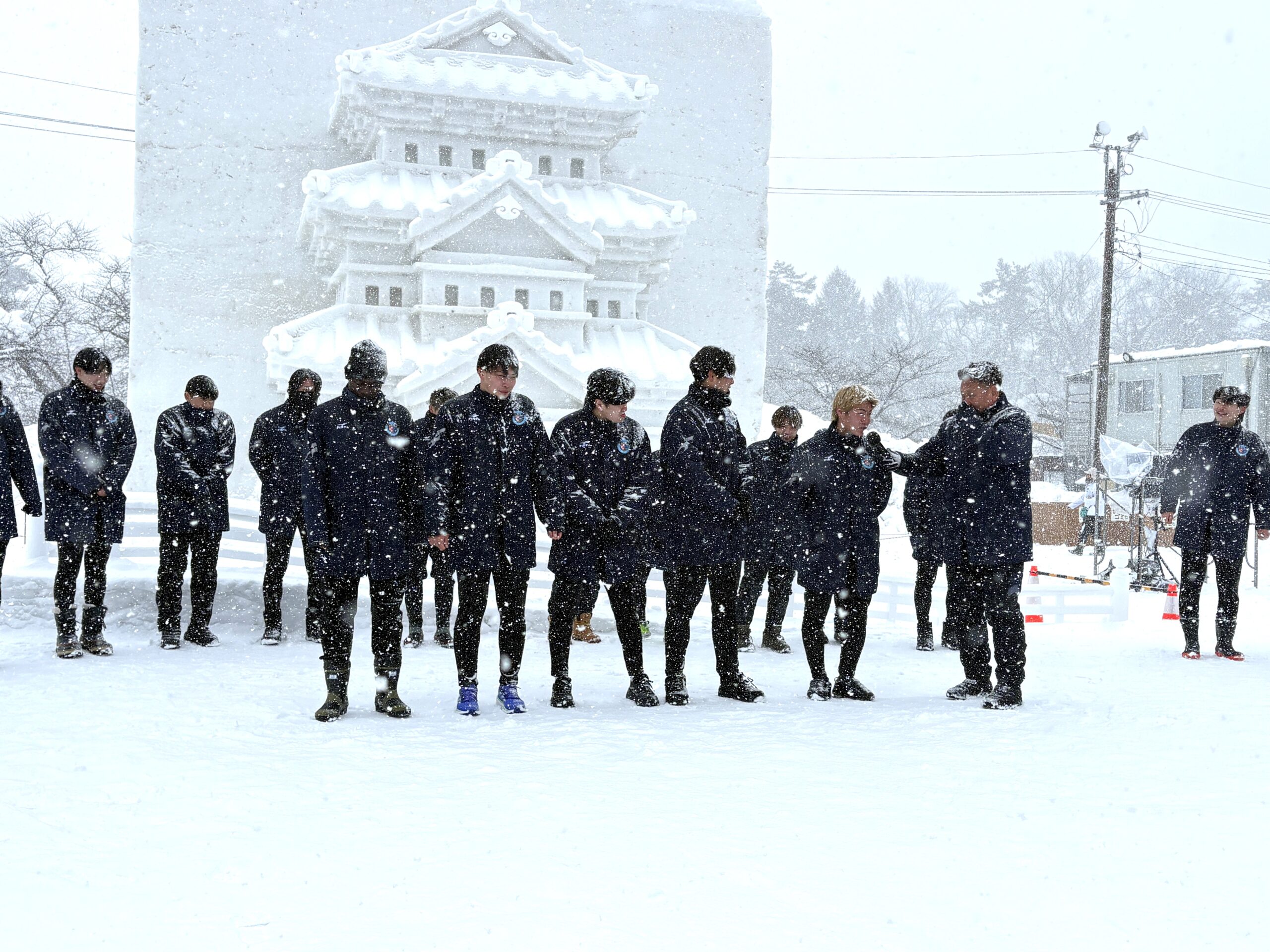 ボランティア活動には、中三川監督をはじめ、選手・スタッフ15名が参加し、二組に分かれて一人暮らしの高齢者のお宅2か所の除雪を行いました。屋根まで積もった硬い雪に苦戦しながらも、地域の皆様が安全に過ごせるよう声を掛け合って作業しました。
