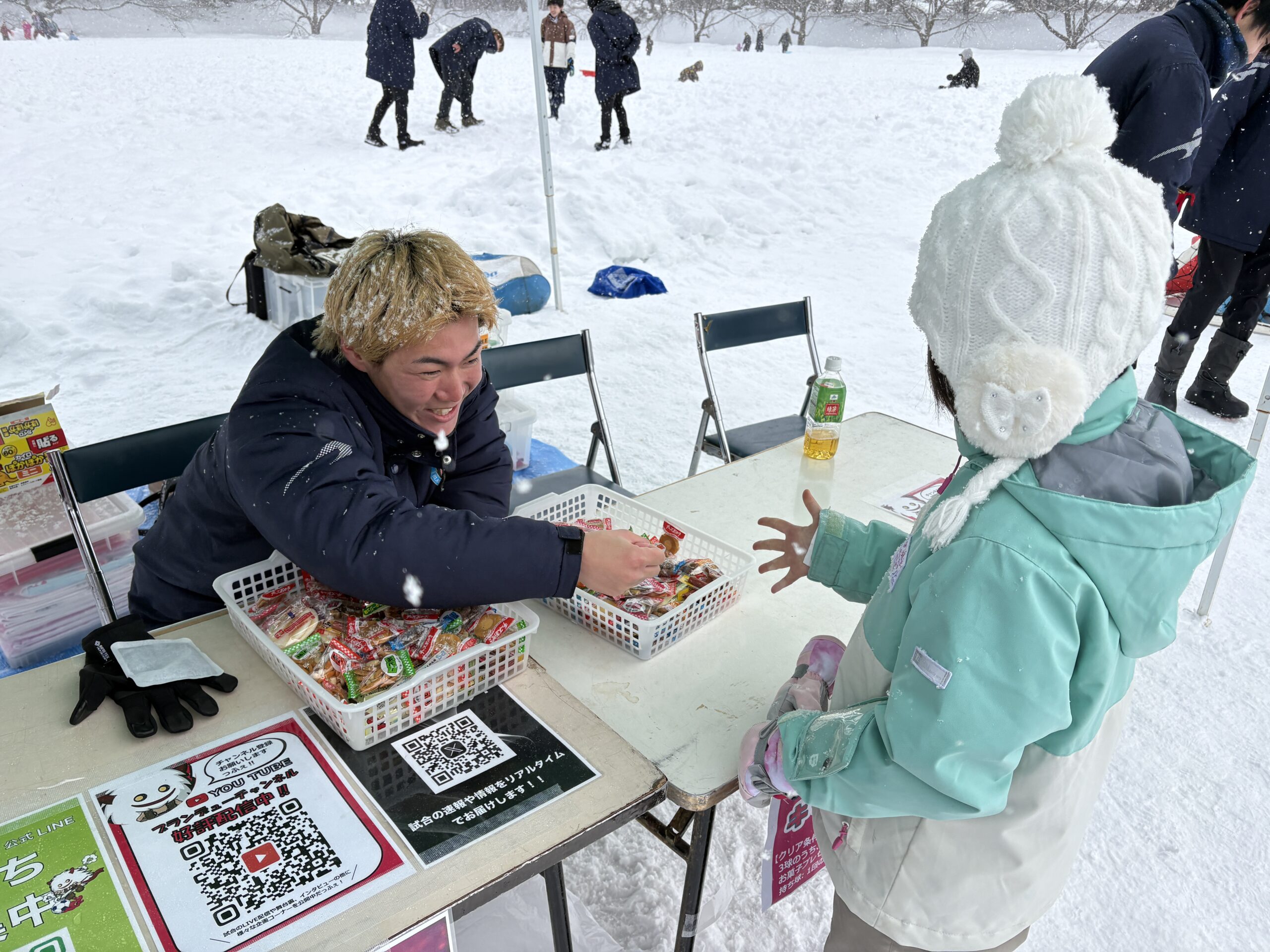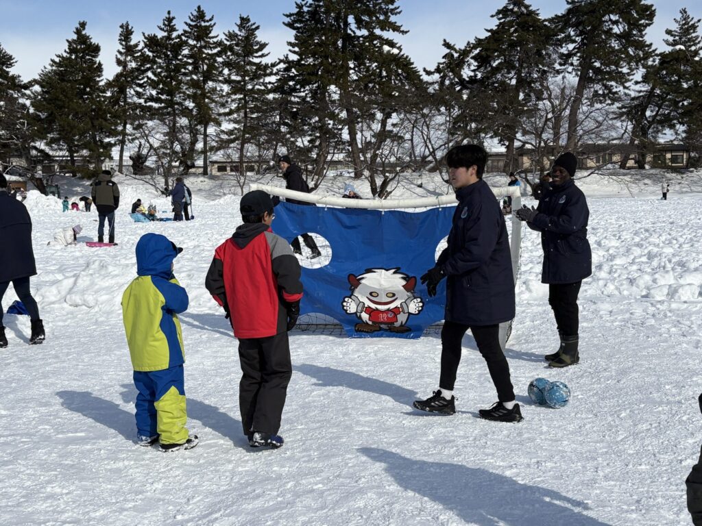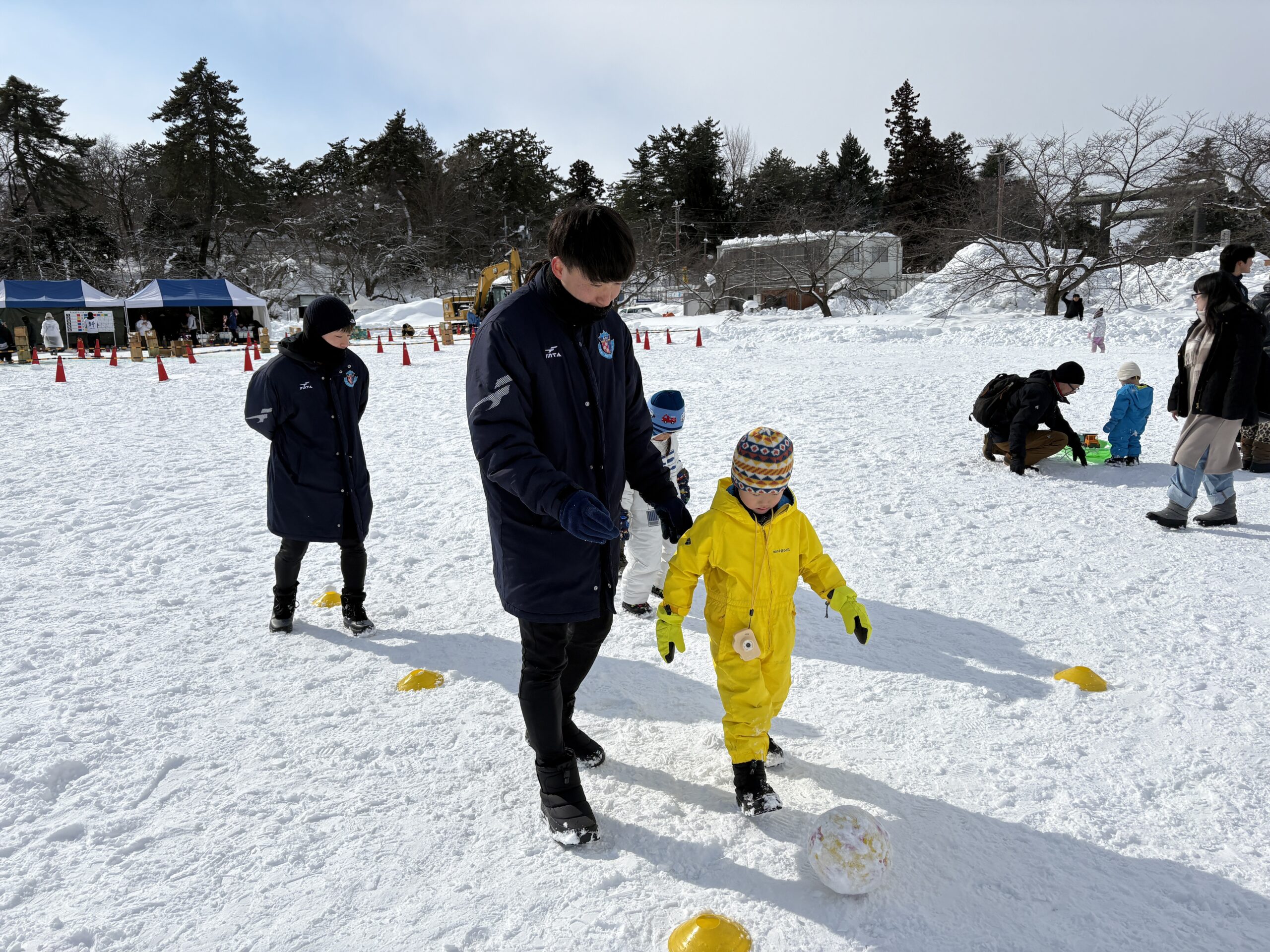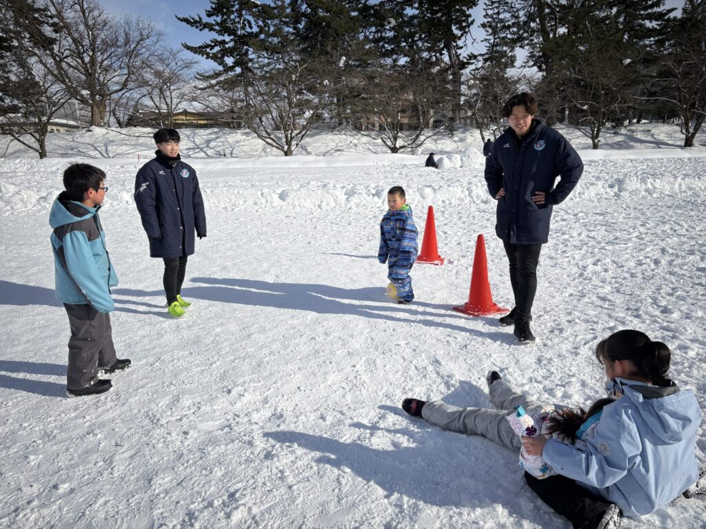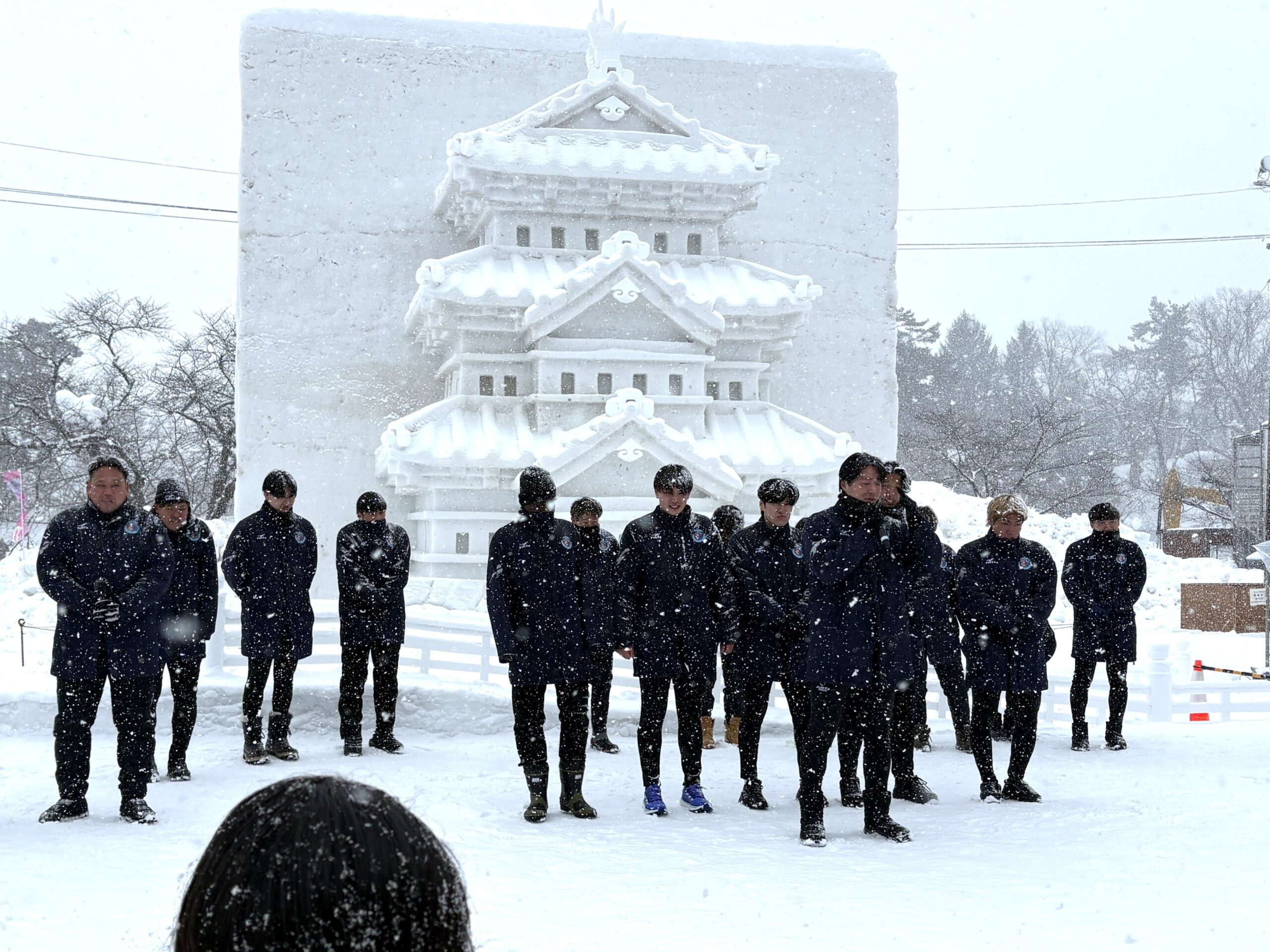 ボランティア活動には、中三川監督をはじめ、選手・スタッフ15名が参加し、二組に分かれて一人暮らしの高齢者のお宅2か所の除雪を行いました。屋根まで積もった硬い雪に苦戦しながらも、地域の皆様が安全に過ごせるよう声を掛け合って作業しました。