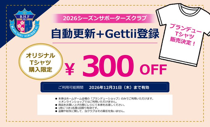 ※サポーターズクラブ特典として実施していた「Gettiiからのお手続き&自動更新登録でオリジナルTシャツ割引券300円分」の対象Tシャツとなります。お持ちの方はぜひご利用ください。
