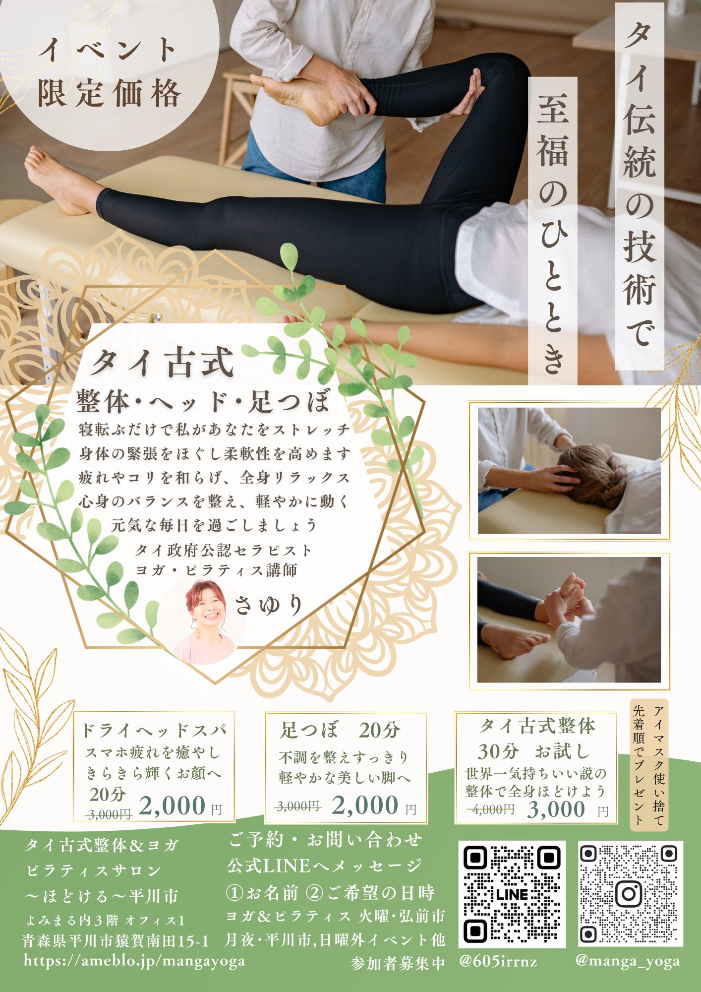 ドライヘッドスパ 20分 ¥2,000/足つぼ 20分 ¥2,000/タイ古式整体 お試し全身 30分 ¥3,000