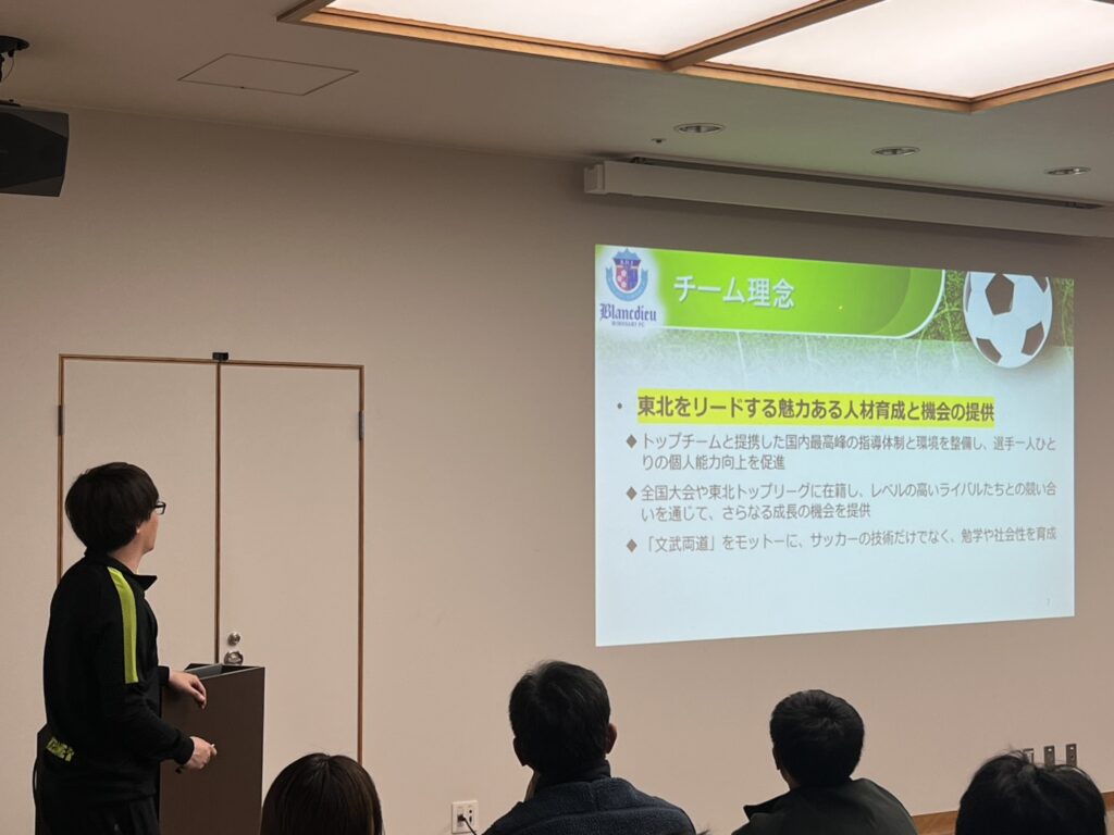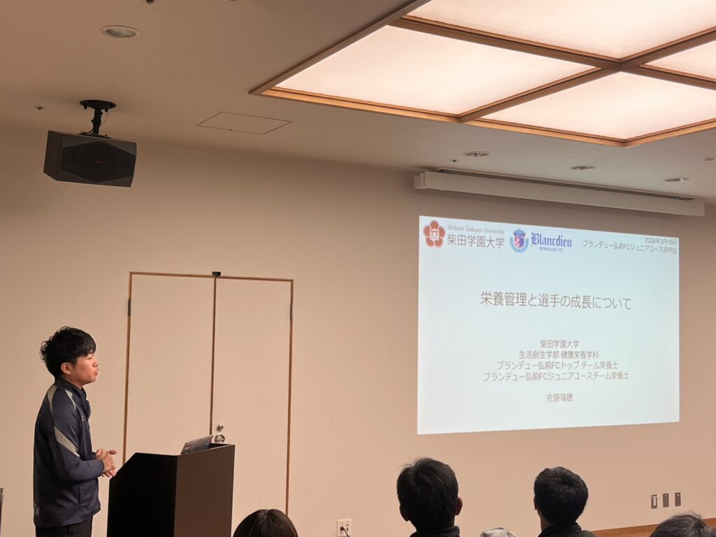 当日は、トップチームのスポーツ栄養士であり、学校法人柴田学園大学健康栄養学科准教授の佐藤瑞穂氏より、中学生年代の成長に必要な栄養や栄養管理についてのお話もいただき、参加いただいた選手・保護者の皆様は、真剣な表情の中にもこれから始まる活動への期待が感じられました。
