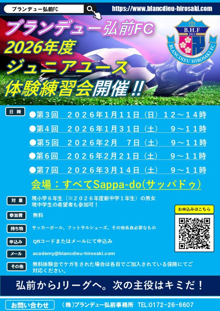 ブランデュー弘前FCでは、2026年度4月より設立・始動するブランデュー弘前FCの下部組織、ジュニアユース(U-15)の無料体験練習会を開催いたしますので、お知らせいたします。