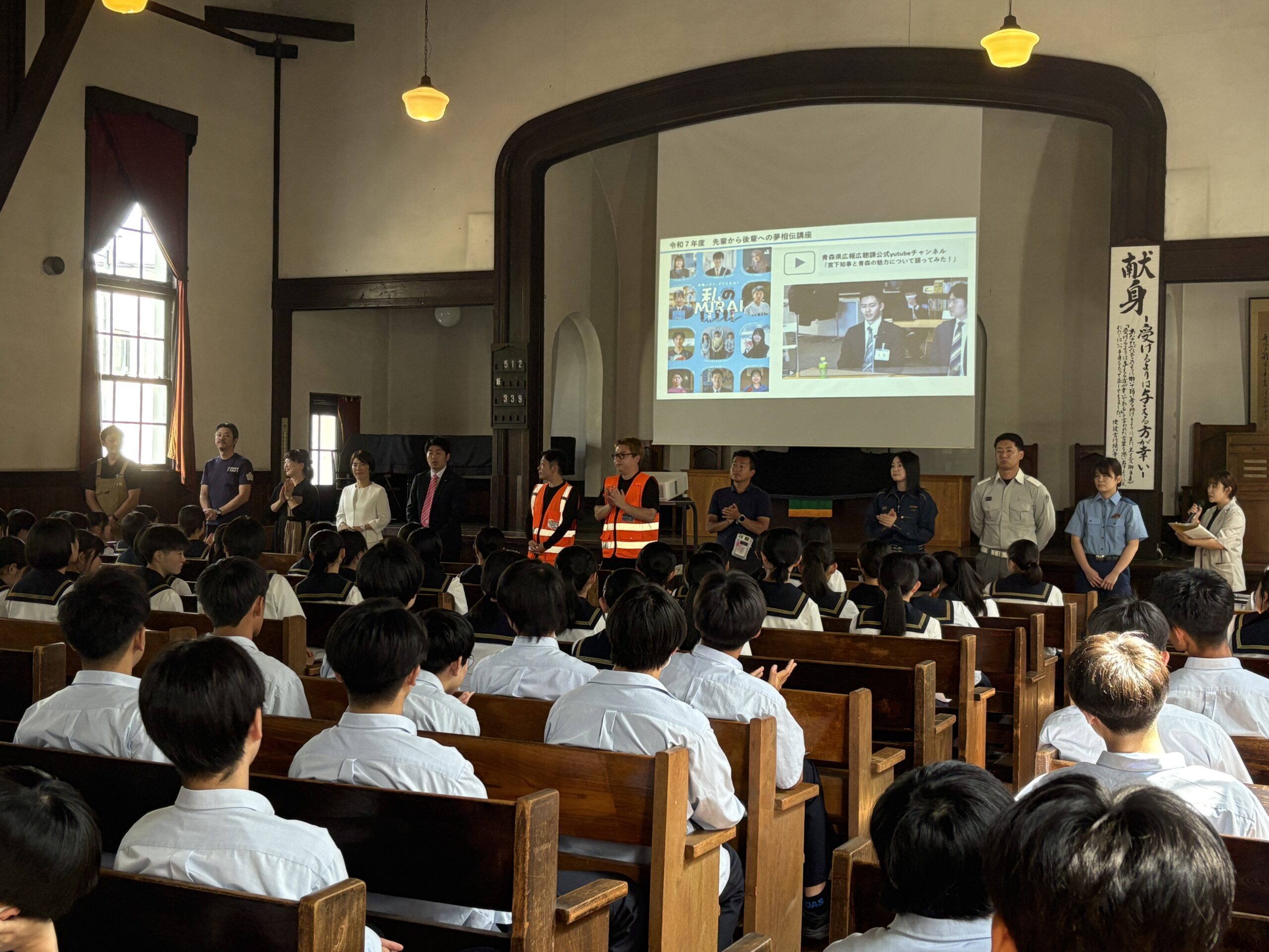 「夢相伝講座」は青森県が主催し、地元で働くことの多様な価値観や魅力に加え、地域を支えてきた地元企業の特徴や起業の魅力を伝達することで、キャリア形成につながる明確な目的意識・職業意識・郷土愛や将来への挑戦意欲の醸成を図ることを目的に、県内中高生を対象に郷土出身の先輩社会人等の講話を行っております。