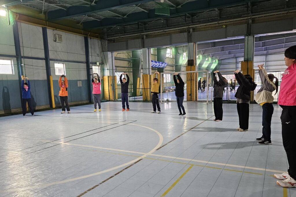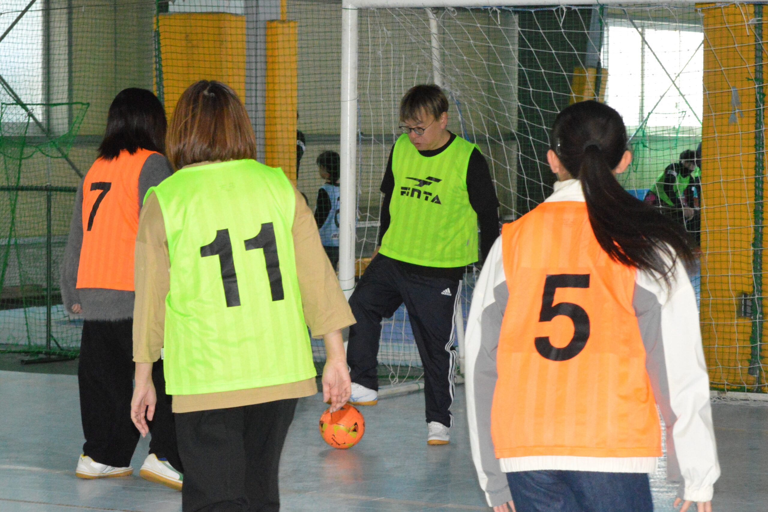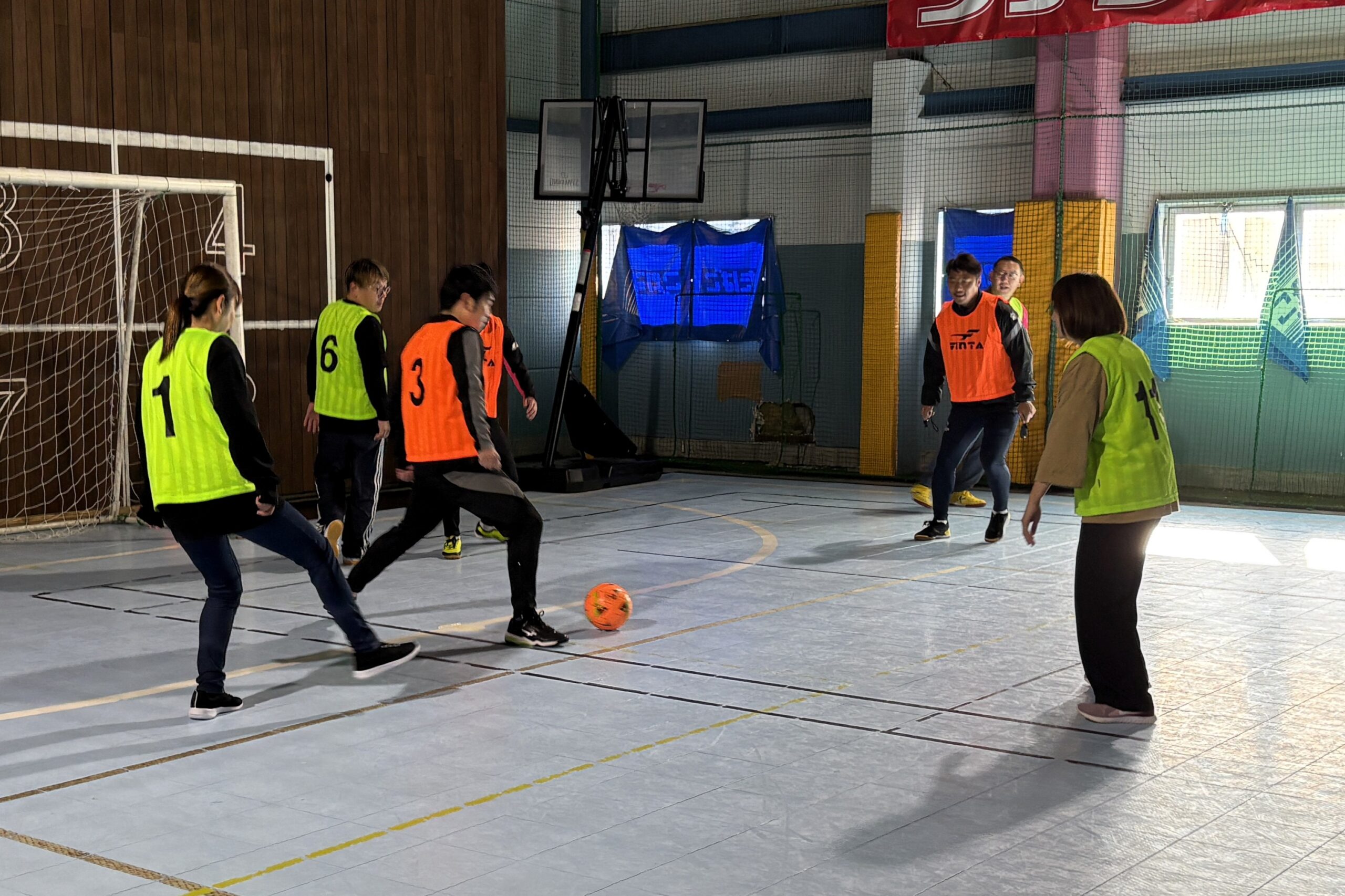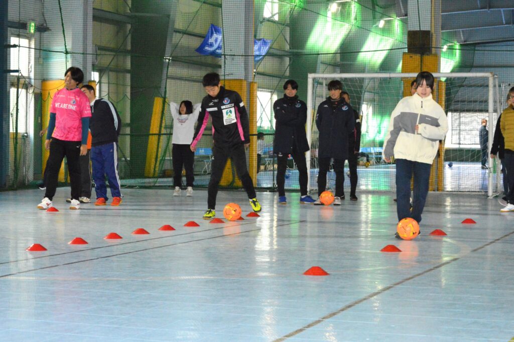 日頃、運動の機会が少ない方でも気軽に参加できる内容とし、ストレッチや有酸素運動を取り入れながら、ブランデュー弘前FCの姜曉一コーチが指導を担当し、選手たちも参加者の皆様と一緒に取り組みました。まずは、ゲーム形式で身体と頭を柔らかくするウォーミングアップを行い、その後はドリブルなどの基礎練習を実施し、最後に3チームに分かれてミニゲームを行いました。幅広い年代の方にご参加いただき、様々な年代の方が交流する姿や、協力し合いながら楽しむ様子が見られ充実した時間となりました。