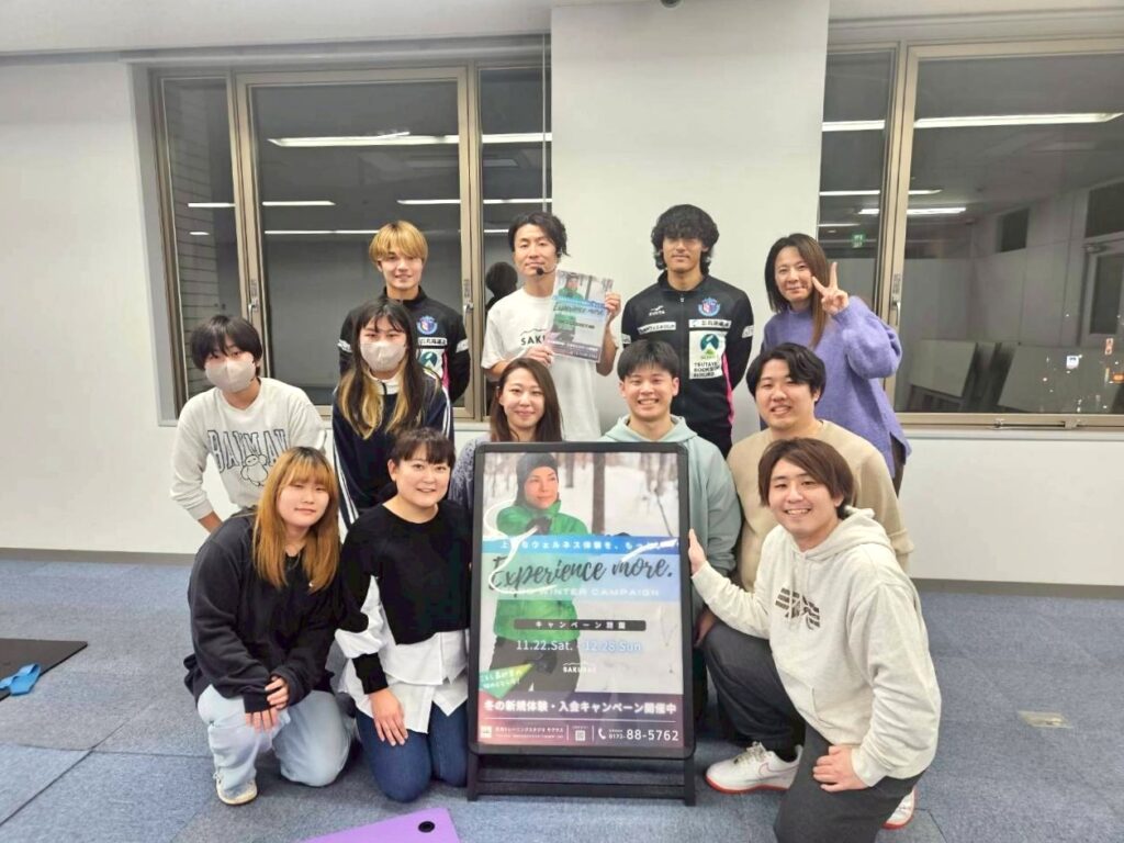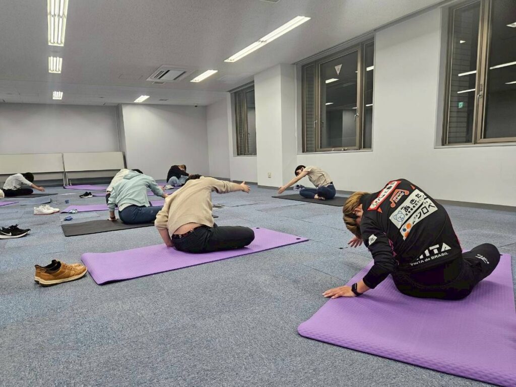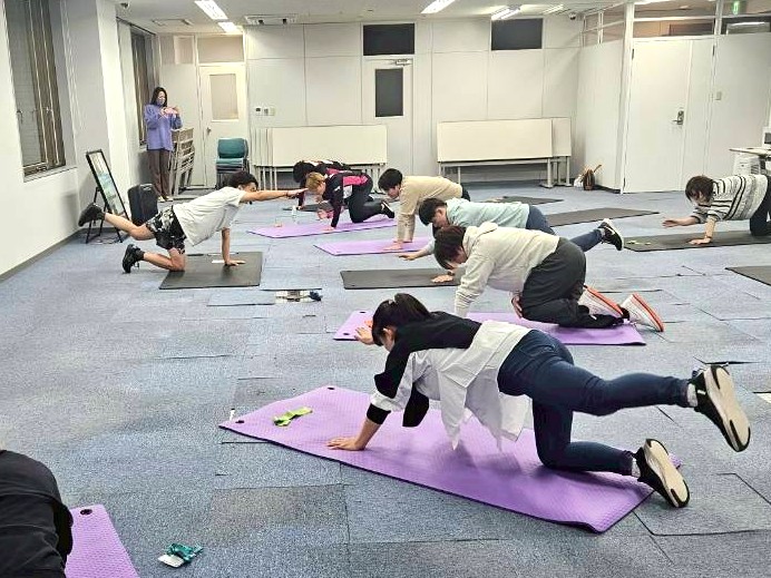 当日は、パートナー企業であります高地トレーニングサクラスを運営する株式会社トライワンズベスト 代表取締役 小林雅貴様を講師にお迎えし、自重で行える筋力トレーニングやピラティスを中心に実施しました。
