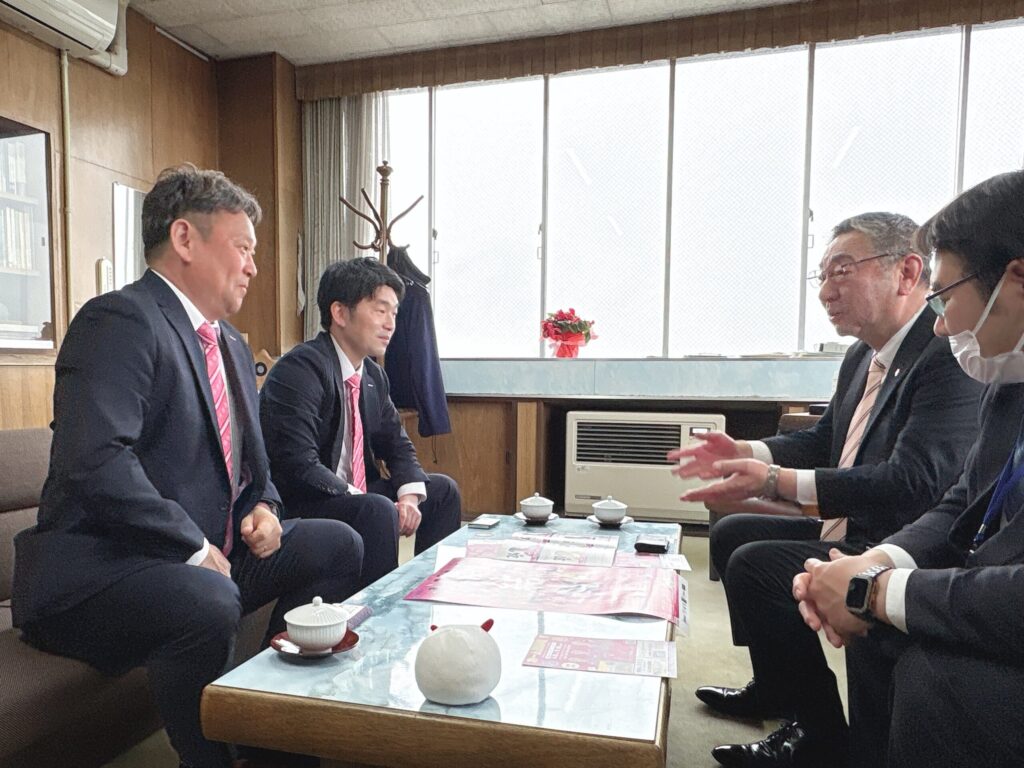今回の訪問では、代表取締役社長 西澤雄貴と監督 中三川哲治が伺い、ホーム開幕戦に向けた意気込みをお伝えさせていただきました。株式会社陸奥新報社代表取締役社長 成田幸男様からは「全員で桜援していきますので頑張ってください!」と心強いお言葉をいただき、大変励みとなりました。