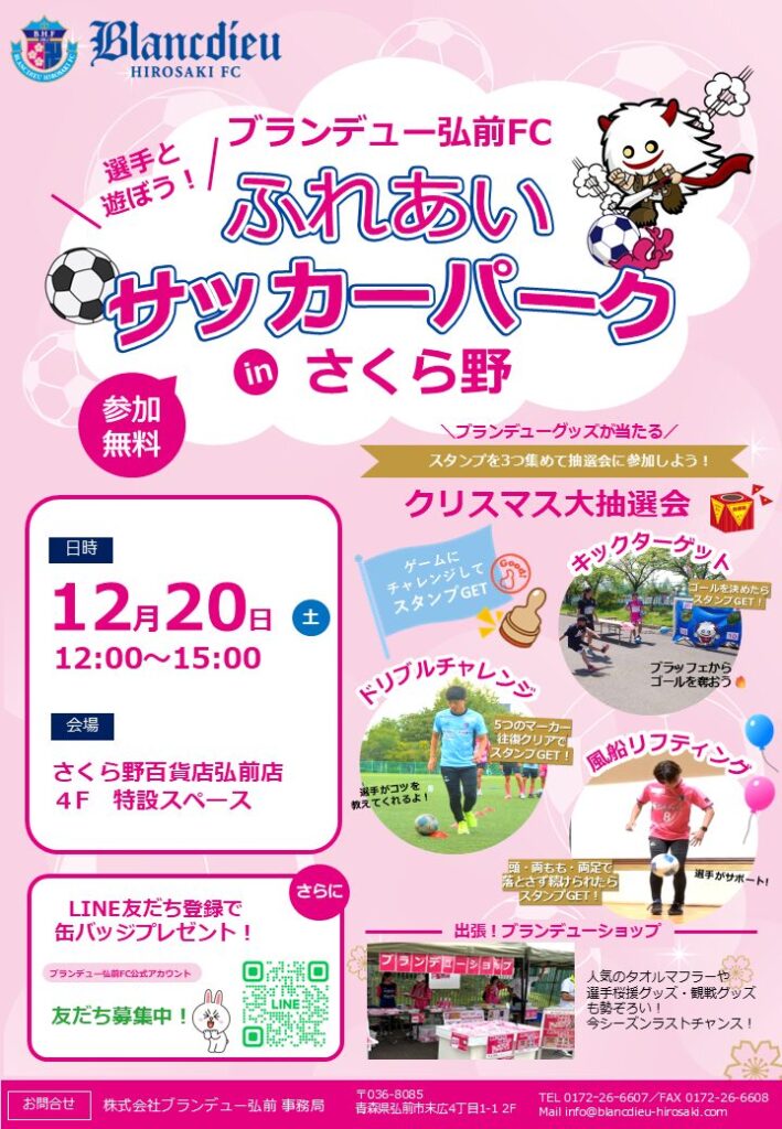 このたび、ブランデュー弘前FCでは12月20日(土)にさくら野百貨店 弘前店にて、「選手と遊ぼう!ブランデュー弘前FC ふれあいサッカーパーク in さくら野」を開催いたしますので、お知らせいたします。