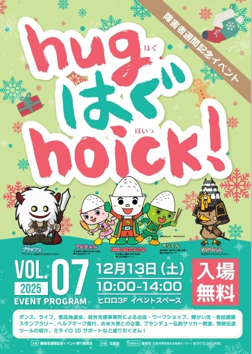 ブランデュー弘前FCでは、12月13日(土)にヒロロ3F イベントスペースで開催される、障害者週間記念イベント「hug はぐ hoick!」に、根本 直弥選手・寺尾 海星選手・甲高 柊汰選手、そしてブラッフェが参加しますので、お知らせいたします。